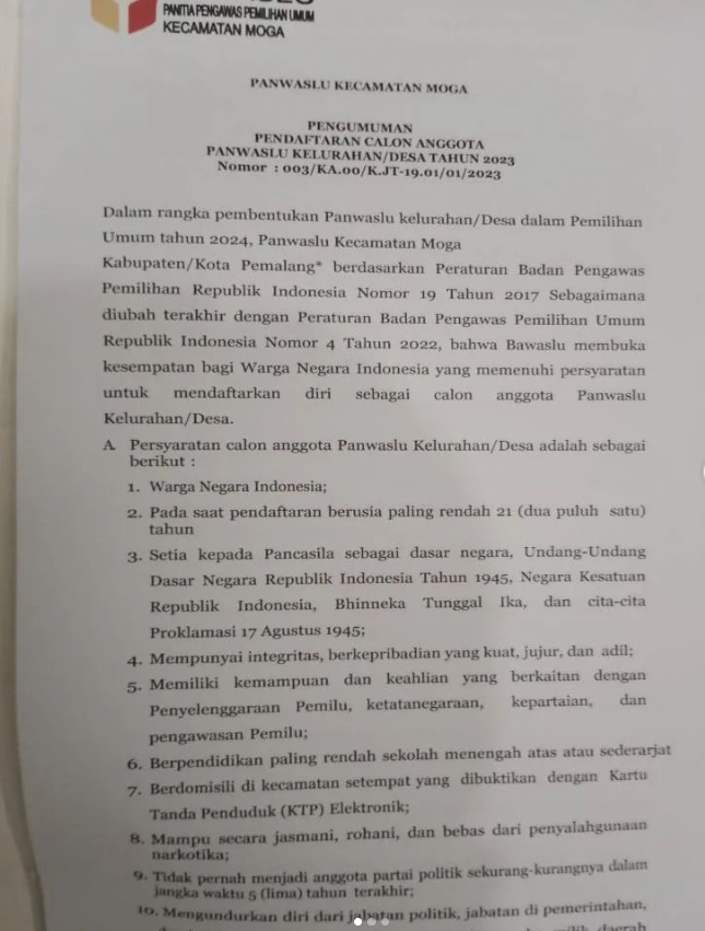 Pengumuman Pendaftaran Calon Anggota Panwaslu